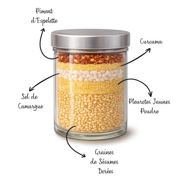 Le furikake jaune est un condiment vibrant et savoureux, alliant la richesse des graines de sésame complètes, l’umami des pleurotes jaunes déshydratés, et les notes épicées et ensoleillées du curcuma et du piment d’Espelette. Parfait pour rehausser vos plats, il est sublimé par la touche délicate du sel de Camargue, offrant une explosion de saveurs à chaque bouchée.